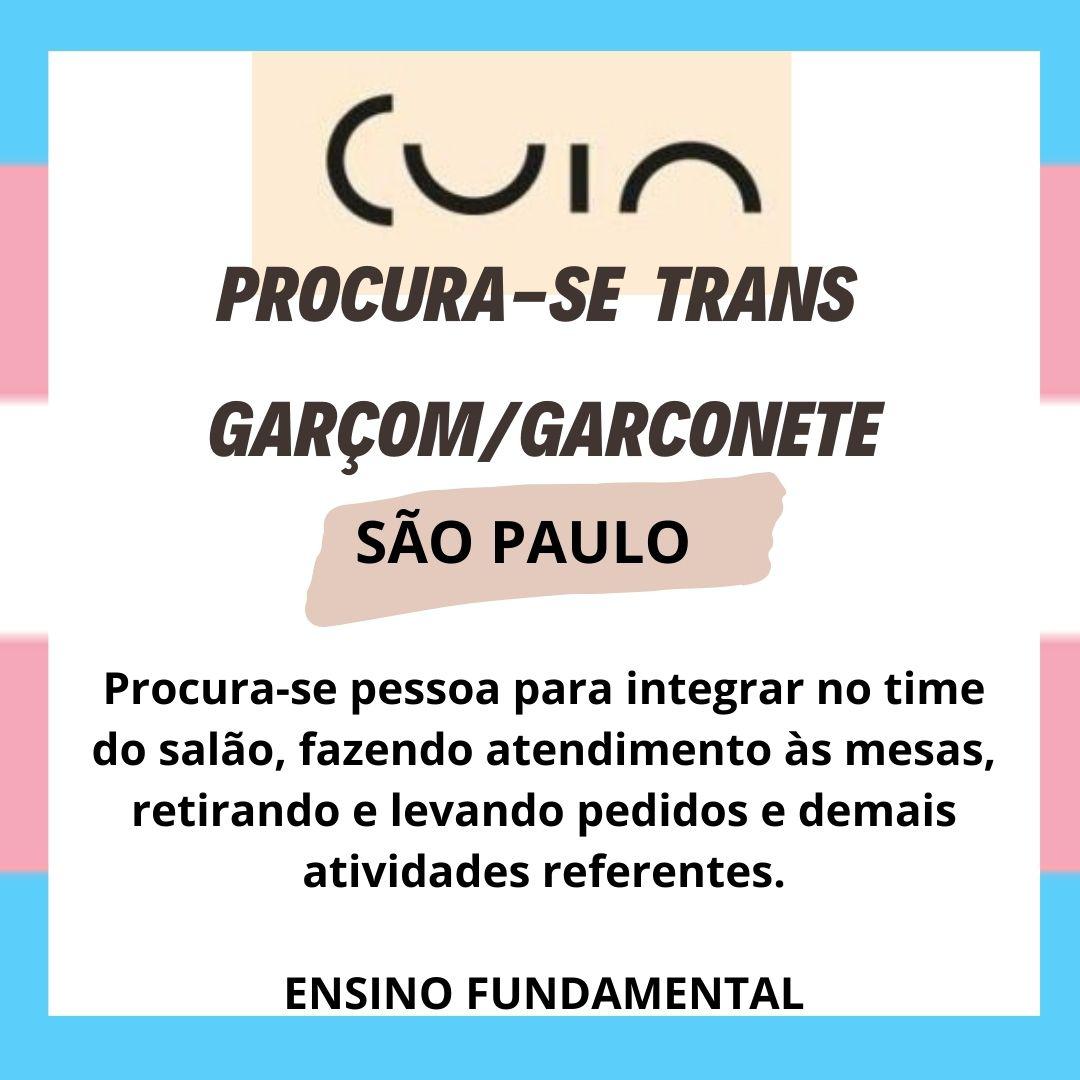CUIA em parceria com a TRANSEMPREGOS, quer ampliar sua Diversidade buscando também profissionais TRANS e abre vaga de Garçom/Garçonete em SÃO PAULO (ensino fundamental)