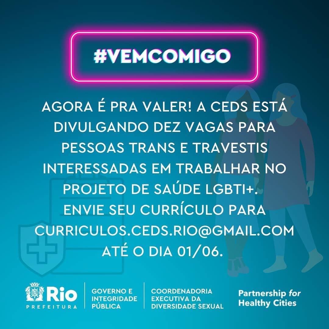 TRANSEMPREGOS DIVULGA: Agora é oficial! A Coordenadoria Executiva da Diversidade Sexual da Prefeitura do Rio está divulgando dez vagas para pessoas trans e travestis no âmbito do projeto de combate à Covid voltado a pessoas LGBTI+. Elaborado pela CEDS