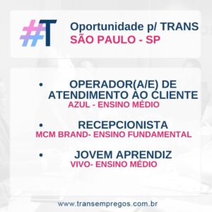 AZUL em parceria com a TRANSEMPREGOS busca profissional TRANS para vaga de Operador(a/e) de Atendimento ao Cliente em SÃO PAULO (ensino medido)